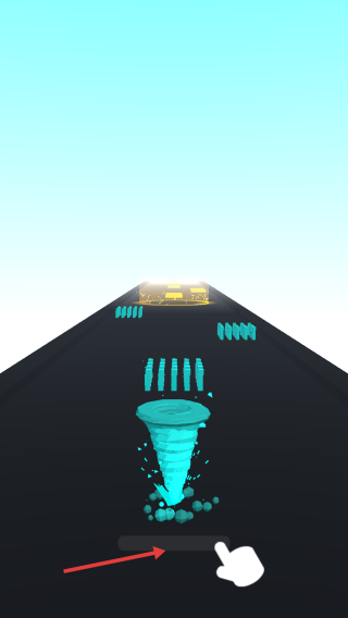 1、启动游戏,手指触碰屏幕下方指定区域并按住,操控蓝色龙卷风在道路上开始移动。