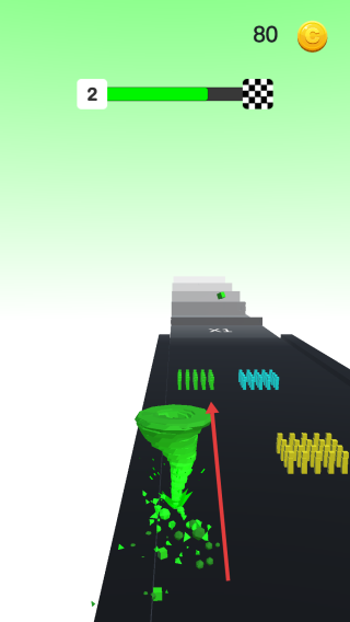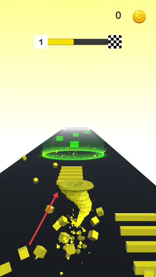 2、行进过程中通过手指灵活调整龙卷风位置,尽可能多地收集道路上的方块,同时关注屏幕上方的进度条和金币数量。