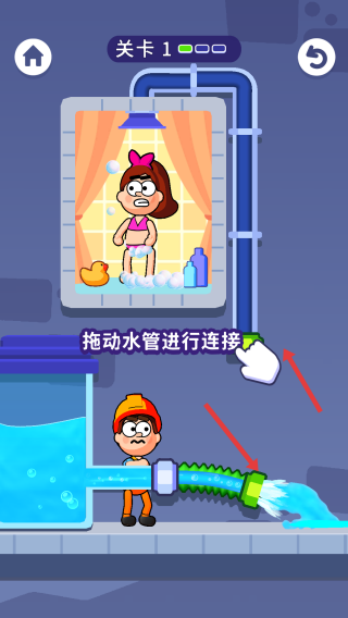 2、连接水管:在关卡(如关卡1),拖动水管部件,连接水源与目标(如淋浴的女孩),让水流通过。