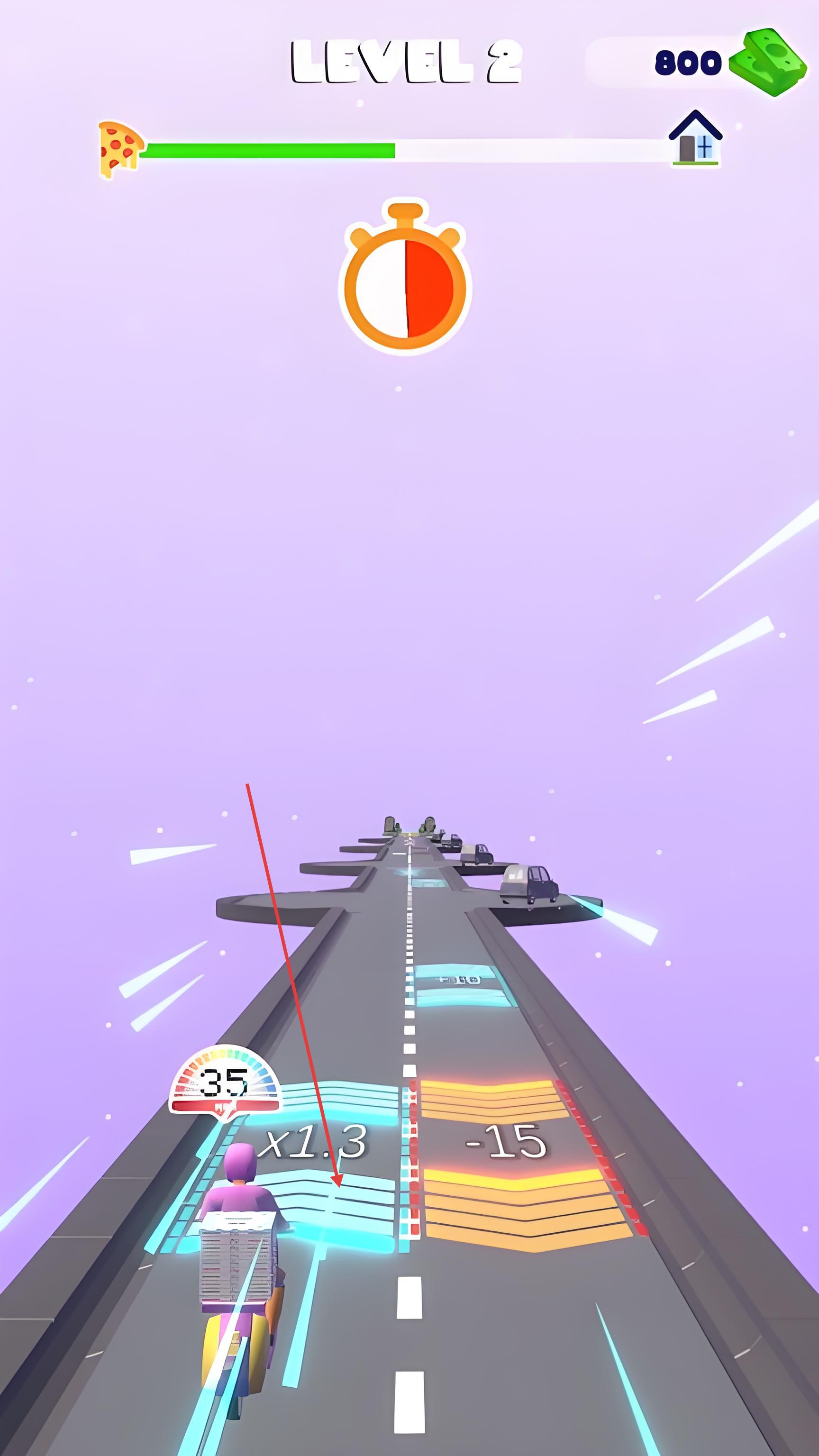 2、奔跑过程中注意路面标识,蓝色加速带可提升30%移动速度,黄色近路箭头指引抄近道捷径,遇到红色餐盒图标需精准拾取以累积订单完成度,同时留意左上角倒计时。