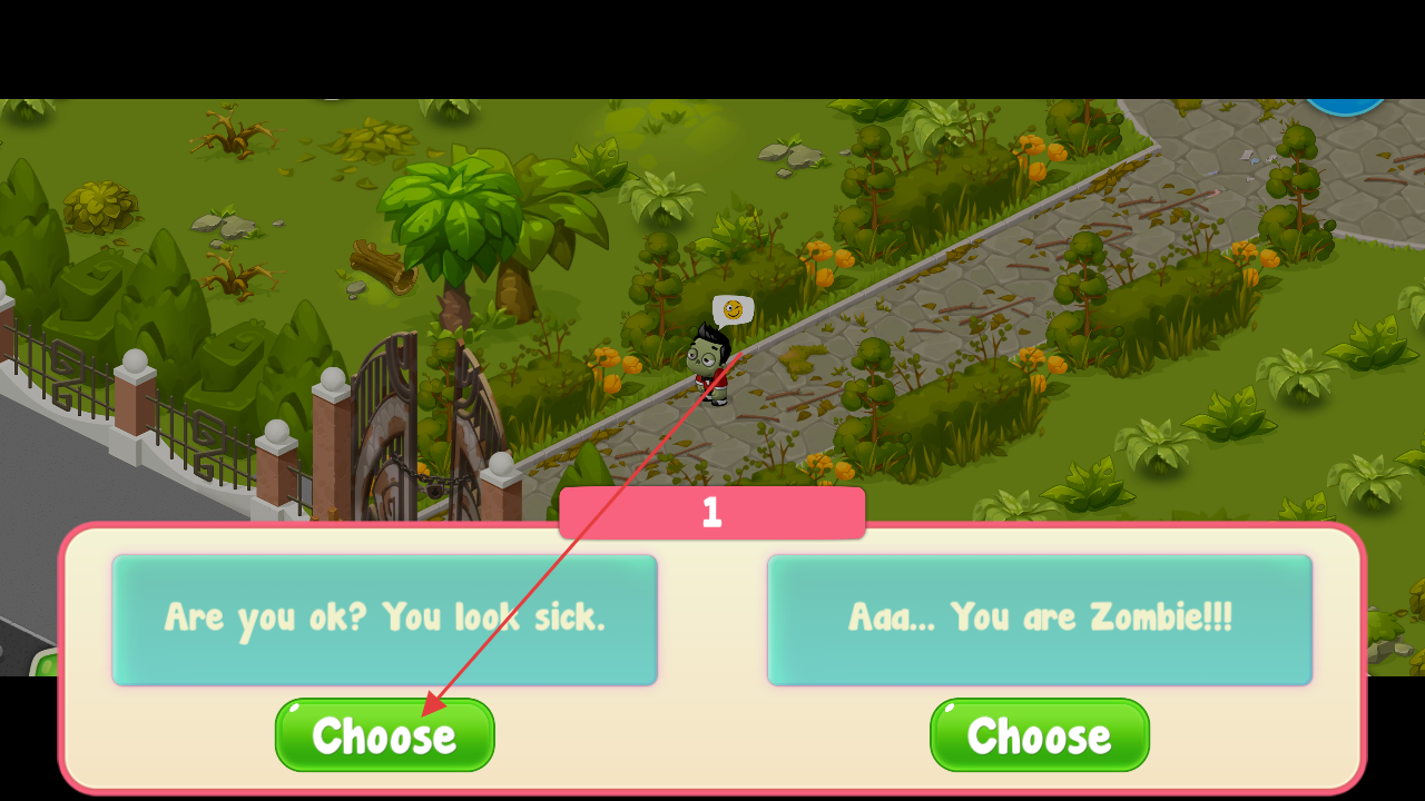 1、点击“PLAY”进入游戏,在小镇场景操控角色,遇到僵尸触发对话,选择回应(如关心/识破)。