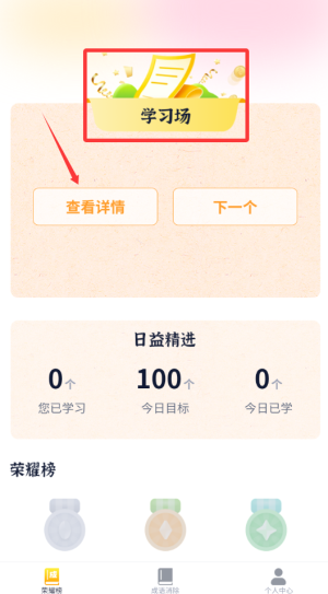 1、点击红框"学习场"区域,查看学习详情。