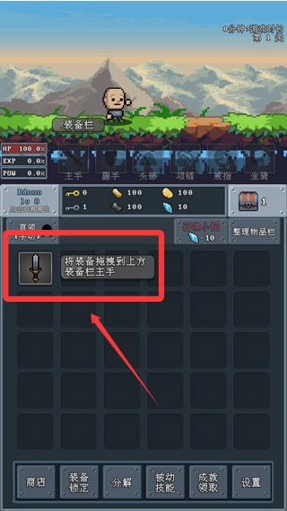 3、然后就可以开始游戏了,按照提示为角色装备武器。