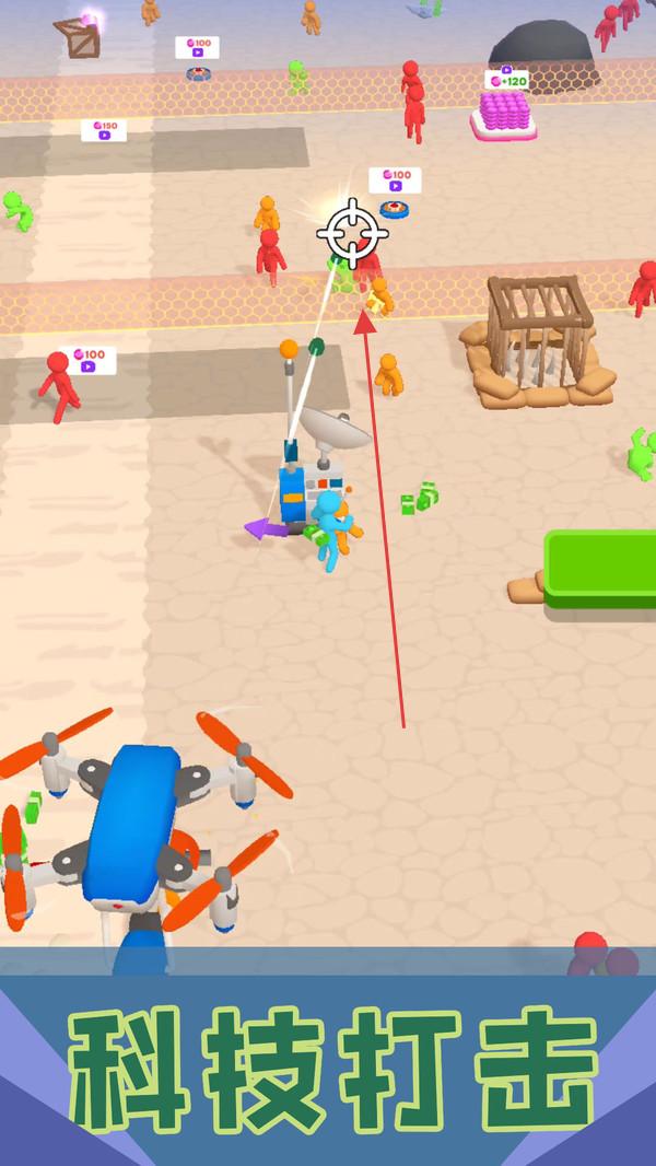 1、操作兵种(彩色小人),利用“科技打击”(无人机、卫星炮)远程攻击敌人,守护基地。