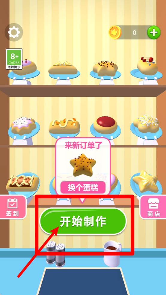 1.订单选择界面:点击“开始制作”即可接受新蛋糕订单,依据顾客的需求准备材料,正式开启甜点制作流程。