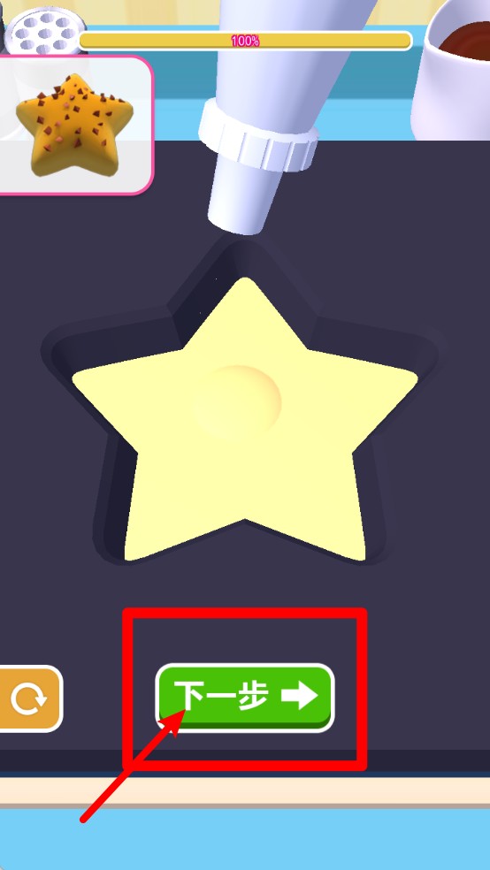 2.制作步骤流程:根据提示完成挤胚、加料、涂层等工序,依照顺序点击“下一步”确保蛋糕造型与细节准确无误。