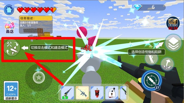 1.切换模式操作:点击左侧按钮可随时切换攻击与建造模式,不同模式下的武器使用和玩法机制会有明显区别。
