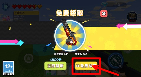 2.观看广告领枪:当解锁高级武器时可选择点击观看广告领取免费试用,轻松获取强力装备助力战斗更顺利。