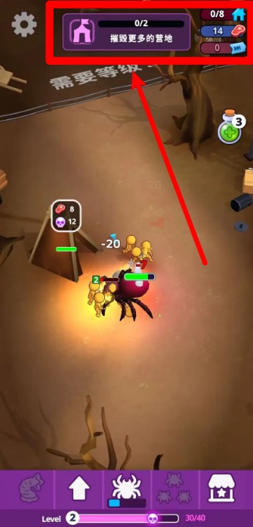 1.主界面上方的任务提示栏明确当前目标,例如“摧毁更多的营地”,玩家需完成目标才能推进进度。