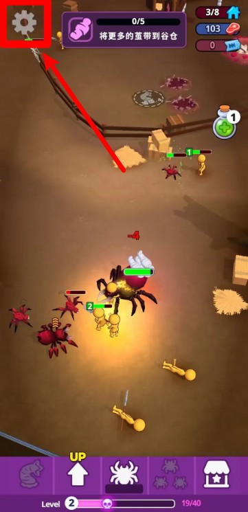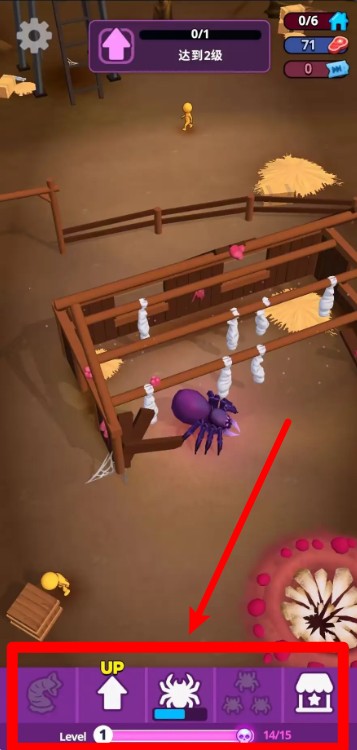 2.点击下方紫色界面的蜘蛛按钮可以进入升级界面,提升蜘蛛等级后能力将大幅增强,更能应对复杂战斗。