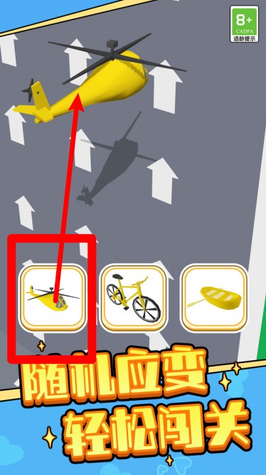 1.点击左下角图标选择直升机形态,可飞越高空障碍与上升通道,轻松穿越复杂地形快速抵达下一段赛道位置。