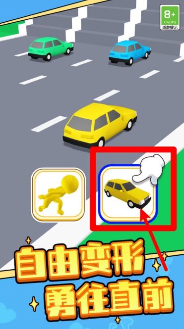 3.在常规道路上选择汽车形态行驶最快,通过滑动切换可应对不同赛段变化,随时变形确保持续前进不被卡关。