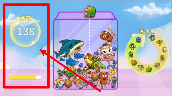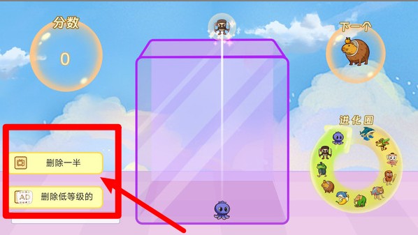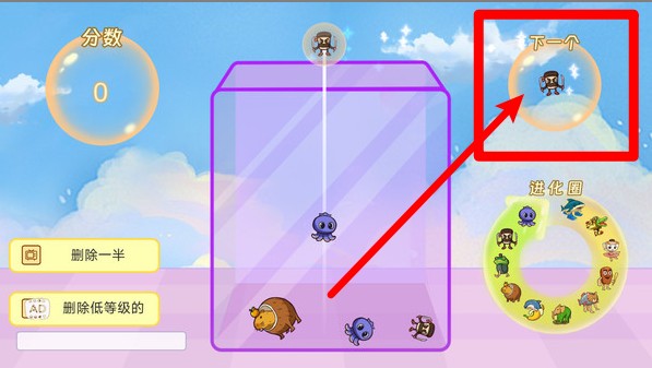 3.预览下一个动物:右上角“下一个”提示可查看即将登场的动物类型,便于提前规划落点位置进行更有效率的合成。