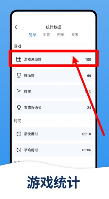 1.查看统计数据:点击页面中的统计数据按钮,可清楚看到游戏总局数、胜率、用时等,帮助玩家了解解题表现与进步。