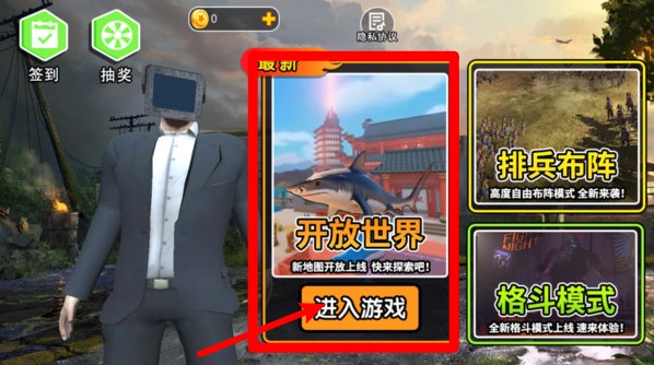 1.进入游戏模式:点击主界面中央“进入游戏”按钮即可开启开放世界玩法,自由体验战斗、探索与排兵布阵。