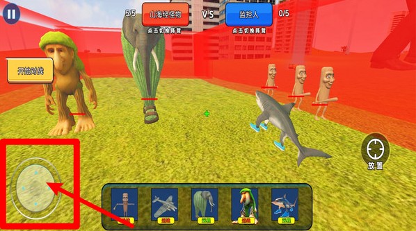 2.拖动控制布阵:左下角的虚拟摇杆用于移动视角和操作角色位置,可在红色区域中自由摆放各种怪物单位。