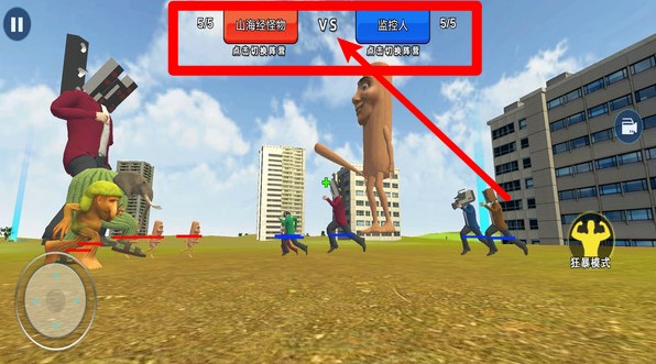 3.战斗队伍状态:画面上方显示双方阵营人数及类型,山海经怪物与监控人正在进行激烈对抗,实时更新战况信息。