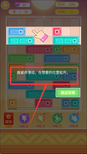 1、玩家需要通过点击屏幕控制方块移动和旋转,将相同颜色的方块拼接在一起形成完整图案,完成消除目标。