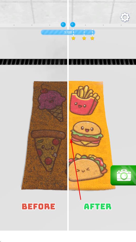 2、场景闯关玩法:穿梭于不同场景关卡,面对各具特点的脏污地毯,运用技巧完成清洁任务,解锁更多关卡内容。