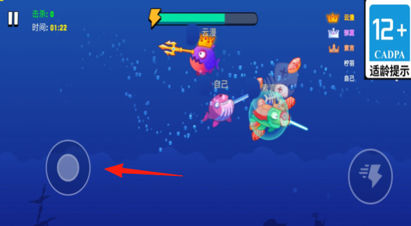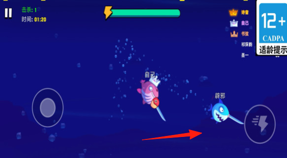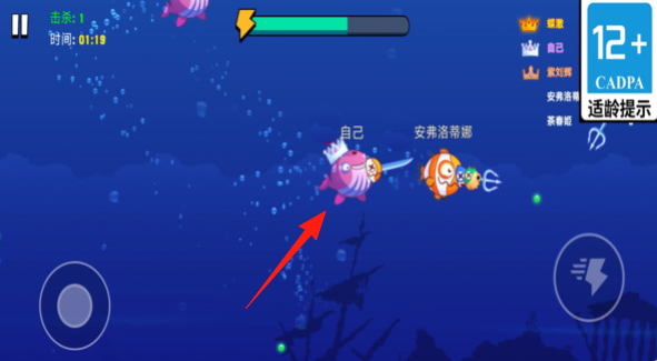 1、操控【自己】的粉色带刀鱼,在海底场景追击【安弗洛蒂娜】等目标,用武器攻击,积累击杀数句号。