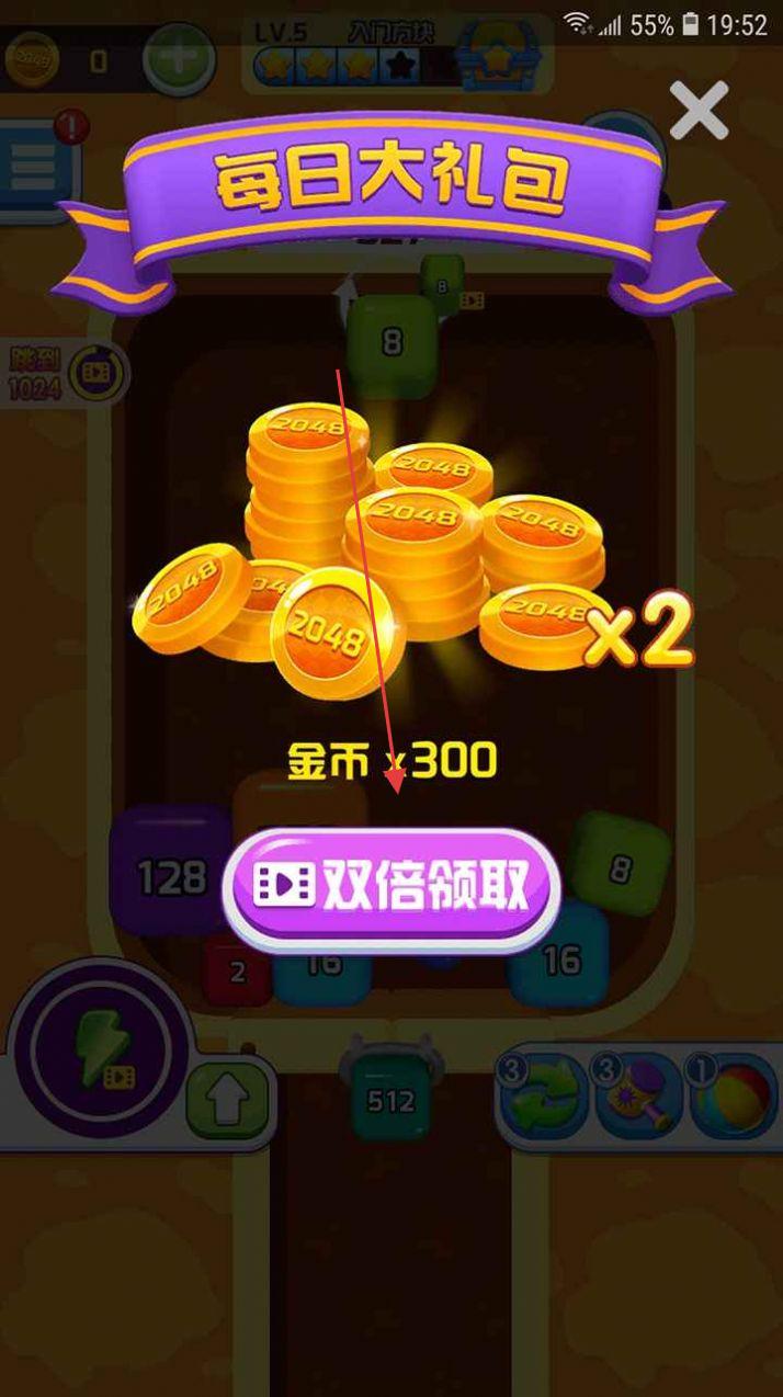 2、点击“领取奖励”“双倍领取”,观看广告获道具、金币,用于辅助合成(刷新、增步等)。