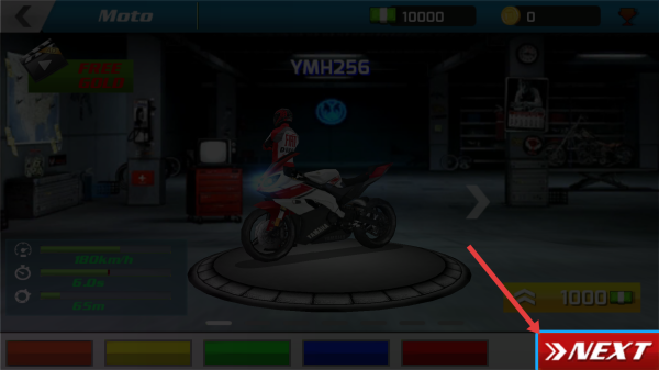 1、车辆准备:在车库选摩托车(如YMH256),点击“NEXT”进入赛道。