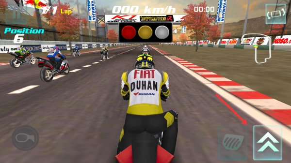 2、赛道竞速:在赛道场景,用虚拟按键(加速、刹车)操控摩托,从第6名起步,超越对手。