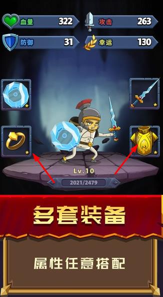 3、装备升级后,点击场景中的怪物触发战斗,滑动屏幕控制骑士走位躲避攻击,点击技能按钮释放招式,击败怪物后点击【前往下一关】继续冒险。