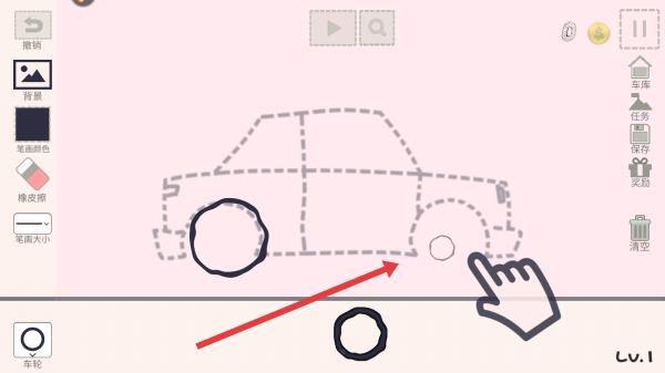 3、造车界面,按指引绘制车轮、车身(箭头指向),完成车辆设计,点击播放按钮,测试赛车性能。