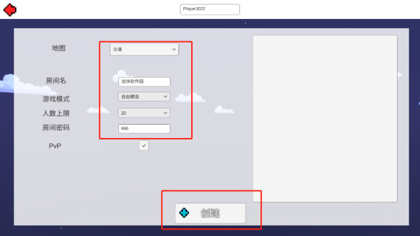 3、点击创建房间可以进行地图选择,房间名设置,游戏模式,人数,以及密码设置,方便与好友同游不被陌生人打扰。