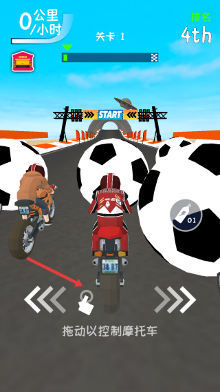 1、开始竞速:在关卡1,拖动屏幕控制摩托车方向,避开足球等障碍,从“START”出发。