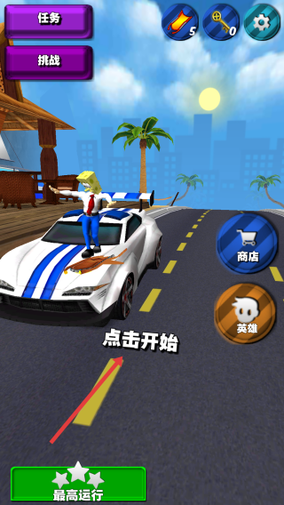 3、挑战任务:通过跑酷、驾驶,完成“任务”“挑战”,利用“商店”“英雄”系统升级,追求“最高运行”记录。