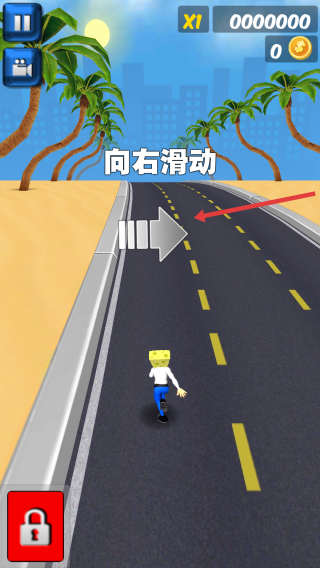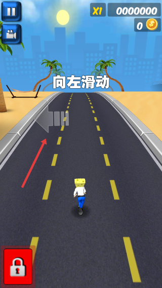 1、跑酷阶段:操控海绵宝宝角色,按提示左右滑动屏幕,躲避道路障碍,在公路场景前进。