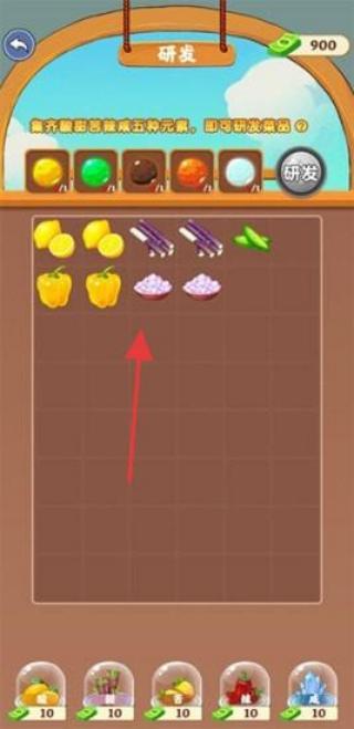 2、进入【菜品研发】(红箭头),收集食材(柠檬彩椒等),按配方合成新菜,解锁菜单。