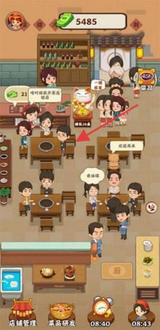 3、顾客到店后(红箭头),快速响应需求(如传菜服务),赚取收益(绿钞),升级店铺。