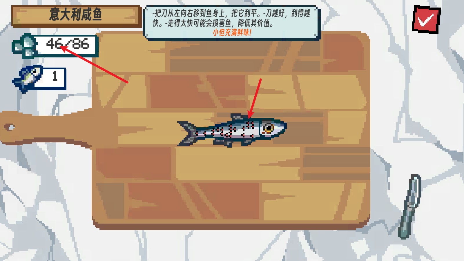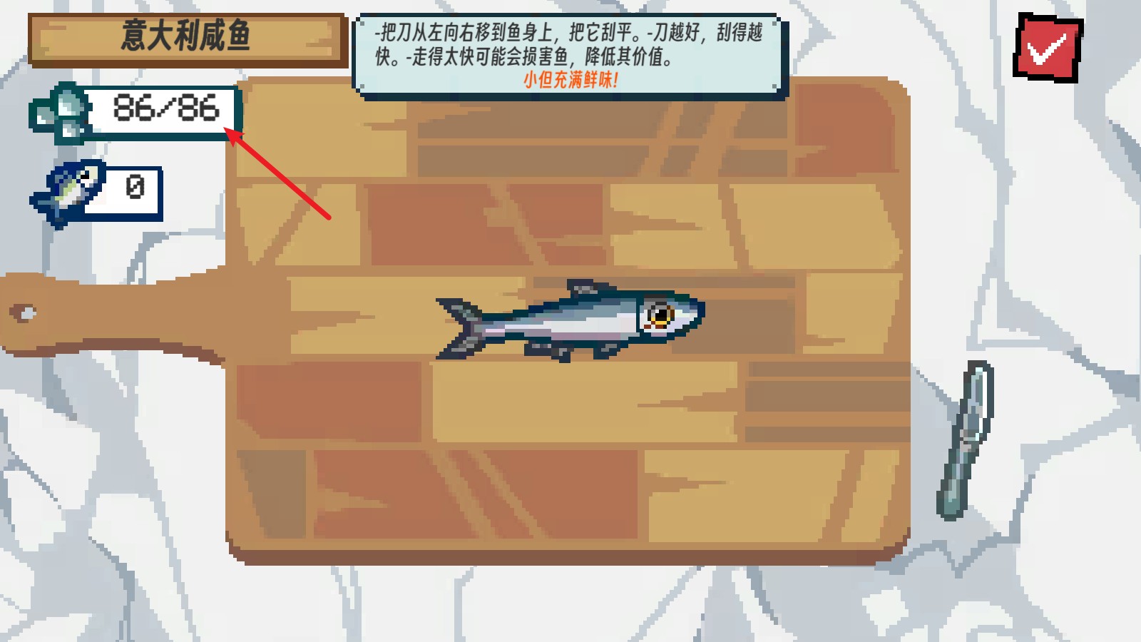 1、开始刮鱼时,先看左上角进度为86/86,将刀从左向右移向鱼身,此阶段要稳住移速,别因过快损坏鱼,保证刮鱼初始步骤平稳推进。