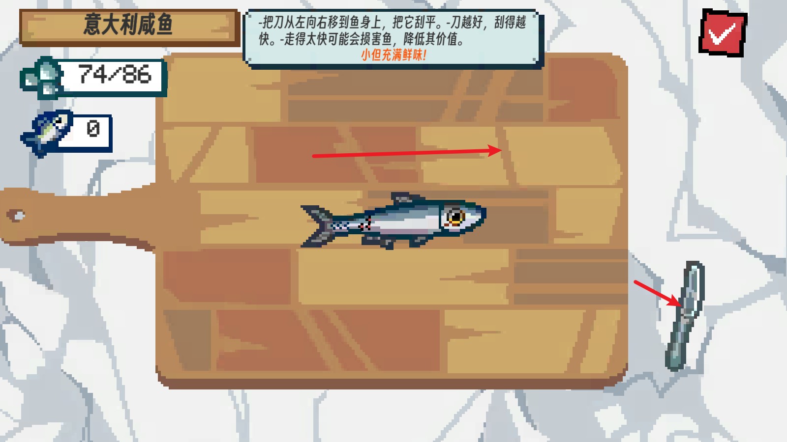 2、刮鱼过程中,进度变为74/86,刀持续右移,移速仍需把控,既要让刮鱼有效推进,又得避免损害鱼,维持鱼的价值,确保刮鱼流程顺畅。