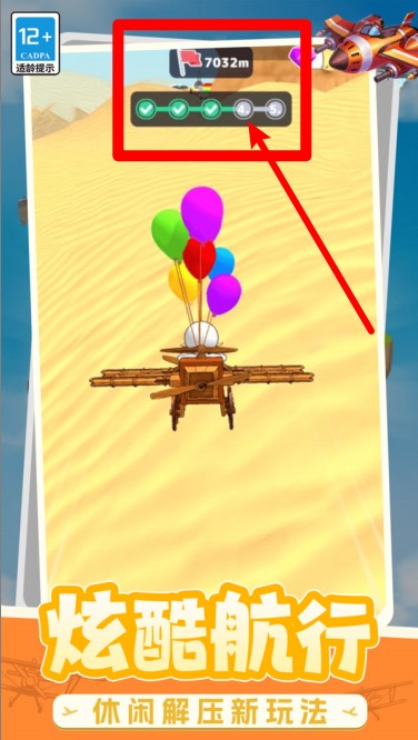 1.飞行进度展示:画面上方显示当前飞行距离及进度条,每完成一个阶段标志都会亮起代表飞行目标的推进。