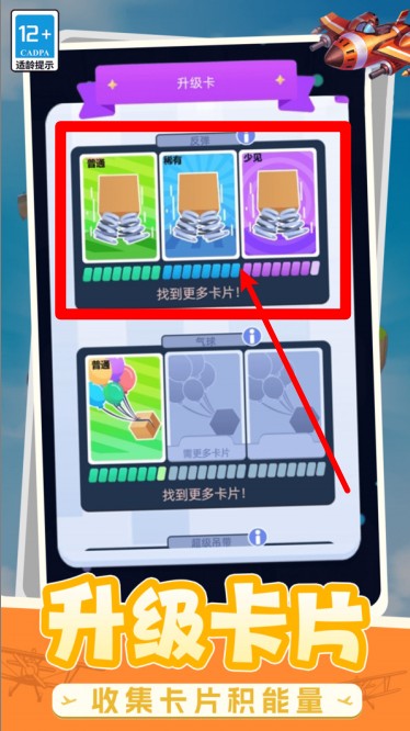 3.卡片能量升级:收集足够相同种类卡片可解锁升级,提升性能后可大幅增强飞机属性与飞行能力。