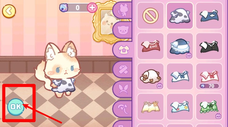 2.搭配完成后点击左下角“OK”按钮可保存当前猫咪造型,并进入下一步操作或返回房间界面。
