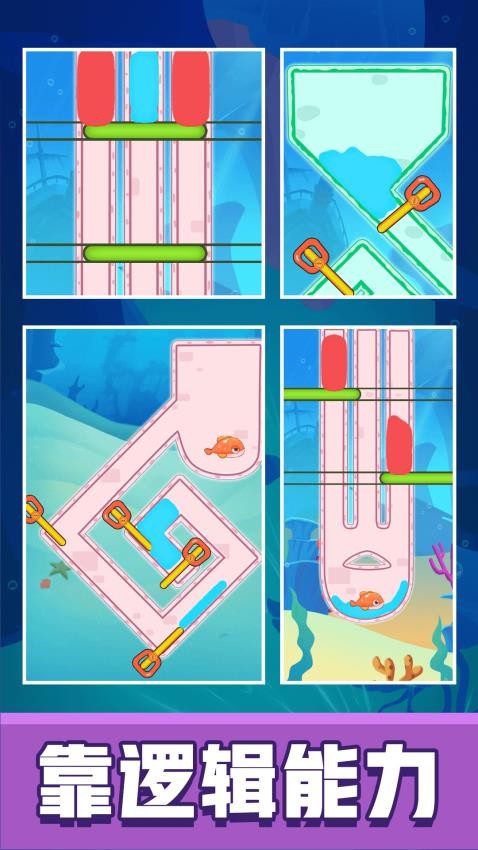 3、益智闯关玩法。通过推箱子、触发开关等方式为小鱼开路。关卡设计巧妙,需要反复尝试才能找到最佳解决方案。