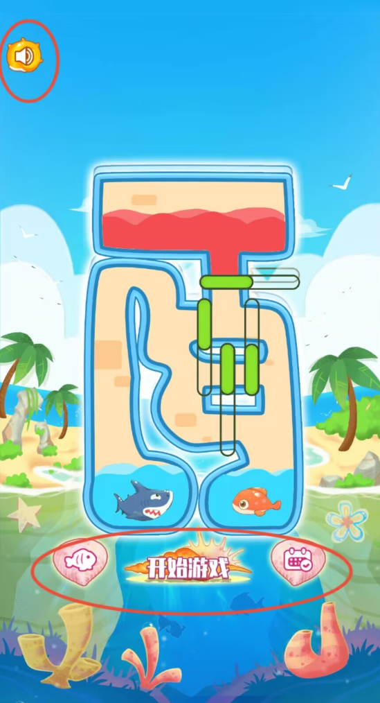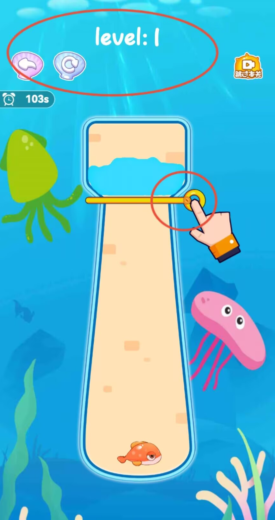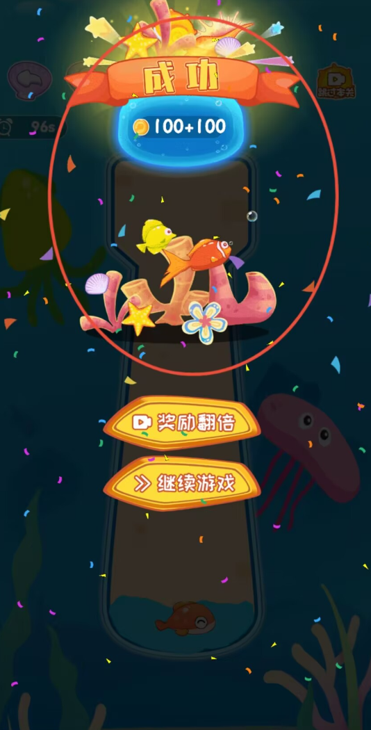 3、当小鱼成功接触水流即判定通关,初始关卡难度较低作为引导,后续逐渐提升复杂度,完成挑战可获得货币奖励。