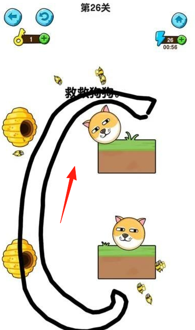 1、第26关围绕上方狗狗,用线条补全封闭区域,将蜜蜂阻隔在外侧,保护狗狗不被叮咬。