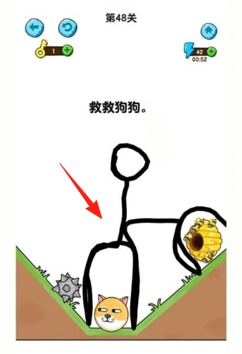 2、第48关修改狗狗上方线条,使其形成稳固封闭空间,避开齿轮,阻挡蜜蜂接触狗狗。