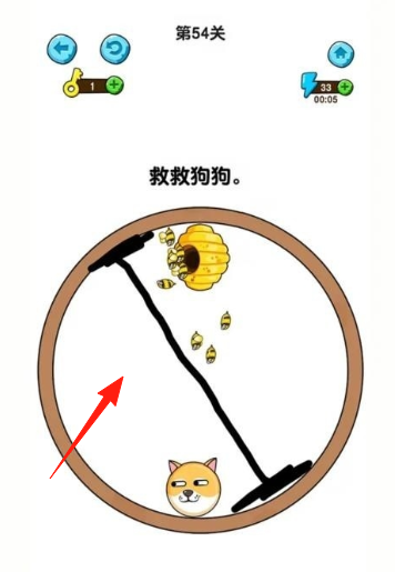 3、第54关调整圆形区域内线条,让其隔开蜂巢与狗狗,使蜜蜂无法到达狗狗身边。