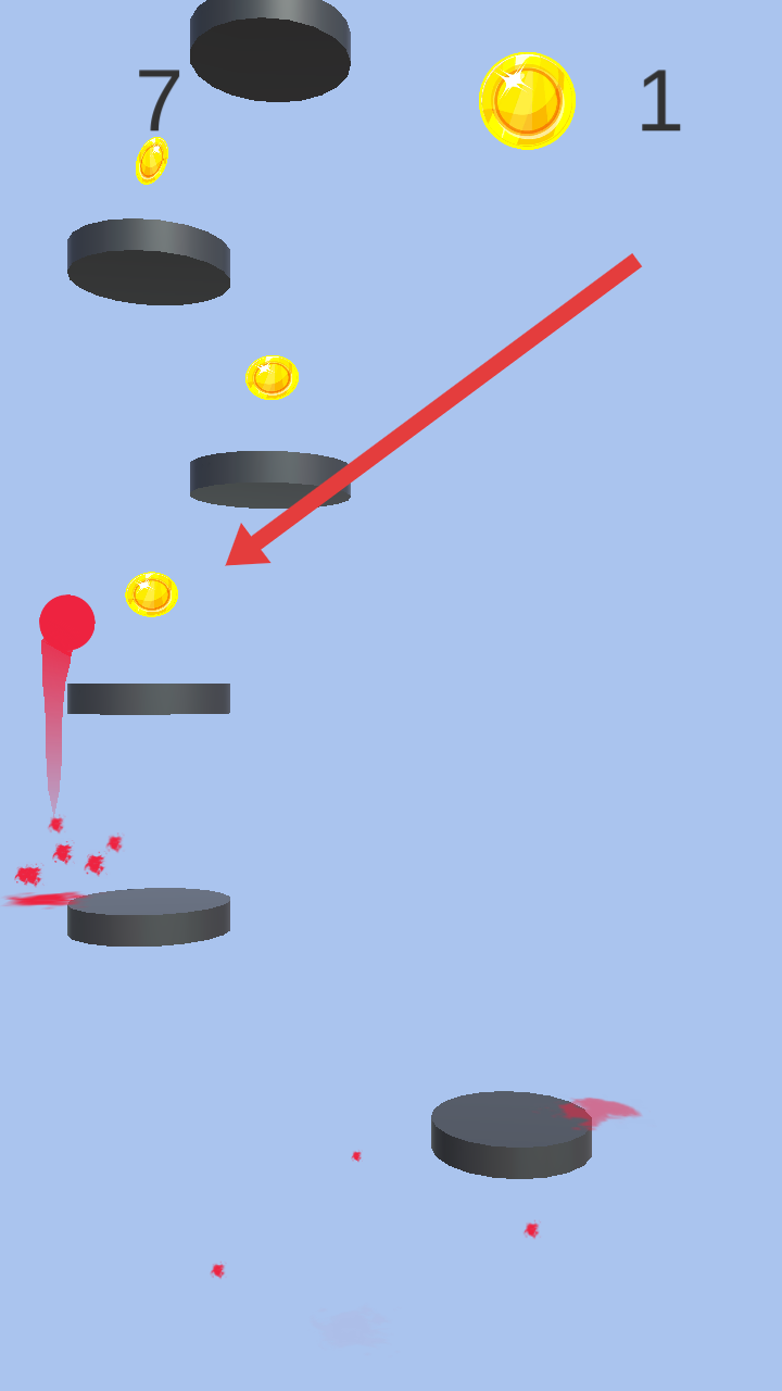1、操控红色小球跳跃,踩踏黑色圆盘向上移动,同时收集黄色金币,注意避开圆盘间隙,防止掉落。