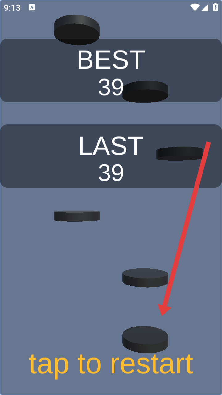 3、在永恒反弹的游戏结束后,点击底部【tap to restart】,重新挑战,尝试突破最高分数(39)记录。