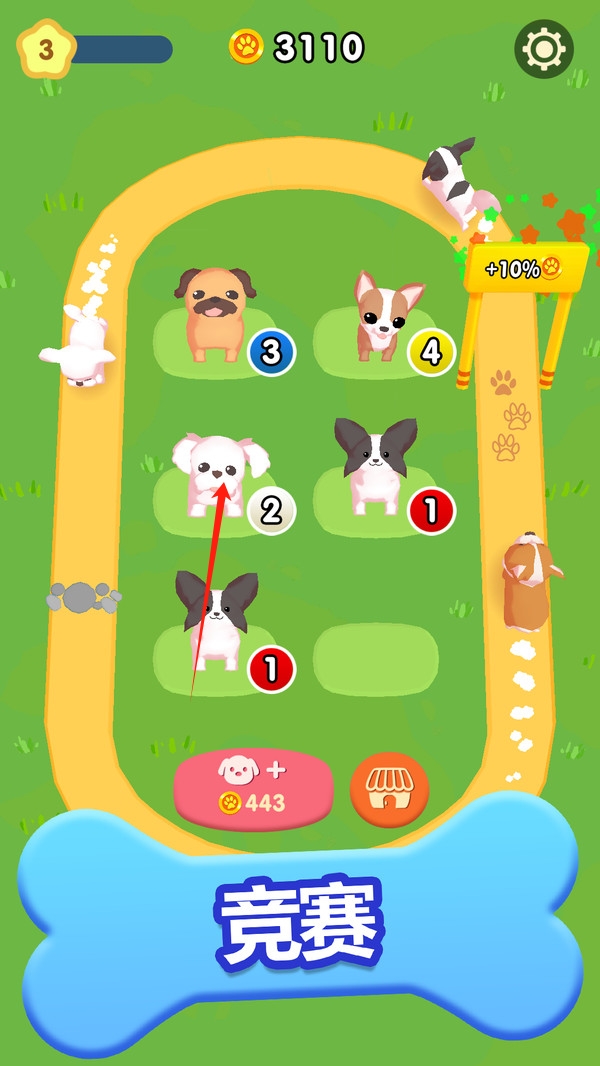 2、合成系统:通过观察、规划与操作完成合成,合理利用狗狗特性与技能组合,连续成功操作触发狗狗狂欢,获得额外资源与奖励,灵活应对不同类型的比赛挑战。