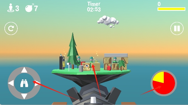 1、瞄准射击操作:点击屏幕任意位置瞄准,再次点击发射子弹,子弹遵循物理规律飞行,撞击物体后产生相应物理效果(如反弹、推动、击碎)。