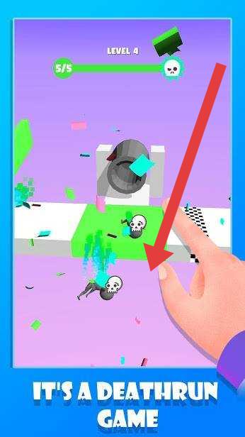 2、滑动屏幕,操作箭头指向的机关,引导敌人触发死亡陷阱(DEATHRUN),达成击杀目标(5/5)。